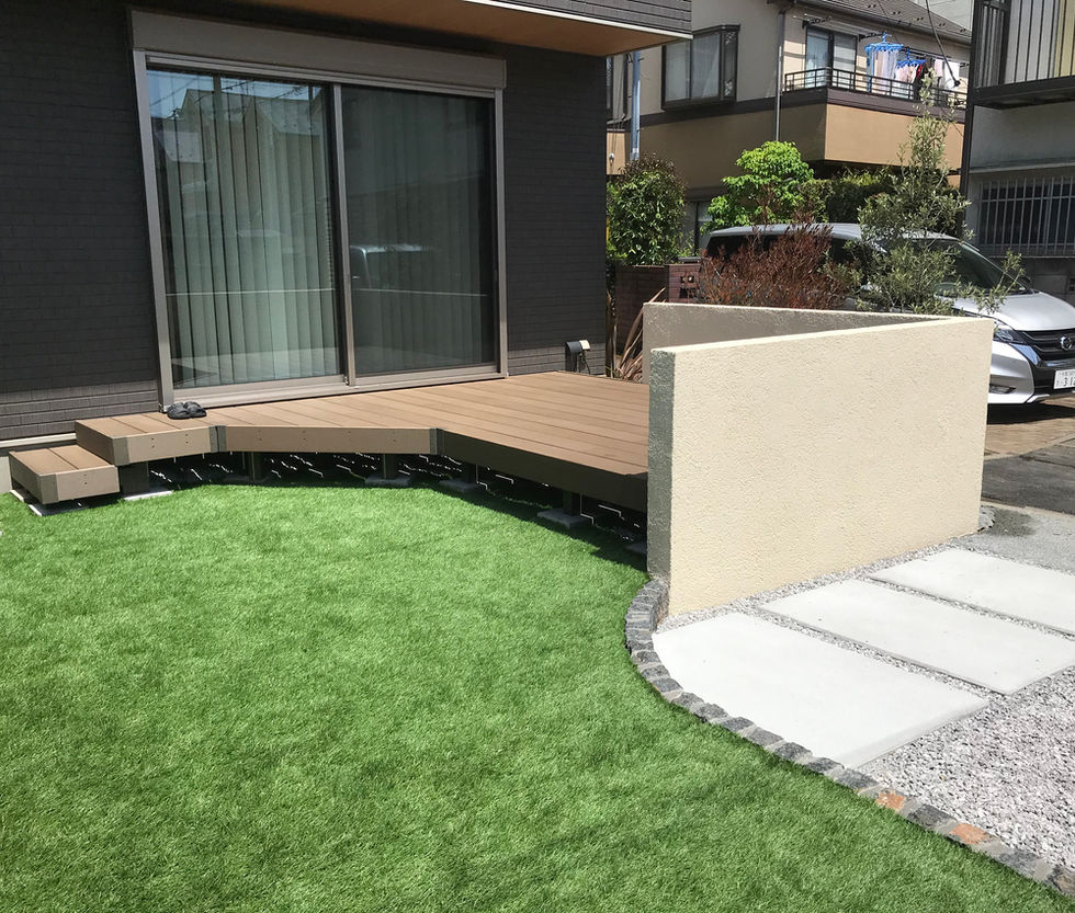 当初は完成のイメージが沸かず、子供が遊べて手入れが楽な人工芝を敷く依頼でしたがデザイナーの方が提案してくれたプランがとても分かりやすくイメージもしやすかったので、完成後のライフスタイルに魅力を感じ追加で植栽や家庭菜園のスペースも依頼しました。完成後はお庭で子供たちが遊ぶだけでなく、晴れた日には家 族そろってテラスに集まり、家庭菜園でとれた野菜を使った料理を食べたりと、家族みんなが充実した時間を過ごしています。
