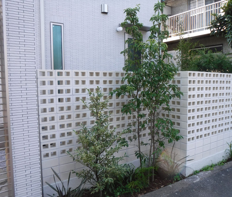 目隠しとし ての機能ではなく、建物のファサードとしてデザインにこだわりました。外構と統一感を持たせストレートなラインを活かし、色調は建物に合わせてダークカラーでシックに仕上げました。アクセントカラーに黄色のポストを取り入れ、モダンなデザインに仕上げています。道路からのアイキャッチとなるポイントに植栽スペースを新設し、赤い実をつけるソヨゴをシンボルツリーとし、目隠しの機能と四季により移り行く葉の変化を楽しめるよう計画しました。